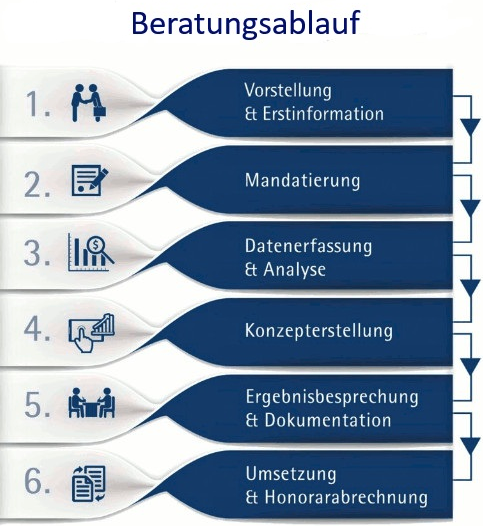 Mit den Erkenntnissen Ihrer privaten Finanzplanung als ersten Schritt, erfolgt eine auf Ihre Bedürfnisse ausgerichtete Beratung und -falls gewünscht-Umsetzung.